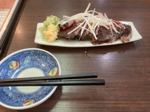 帰る前に好物のカツオのたたきを食した。美味しかった。
