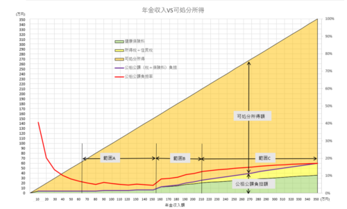 年金収入の増加幅に対し、おおむね25%程度の割合で負担額が増える(介護保険料の固定額があがるポイントを除く)。これは証券の譲渡・配当所得に源泉徴収される約20%を上回る。全体として、負担率の増加は範囲Bよりも穏やかにはなるが、負担額、負担率が大きいので負担感は大きいだろう。(年金年収240万円で負担額33万強)。 一方で、可処分所得の絶対値も大きいので安心感はある。